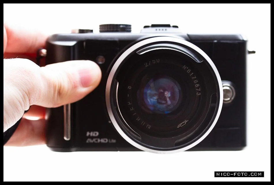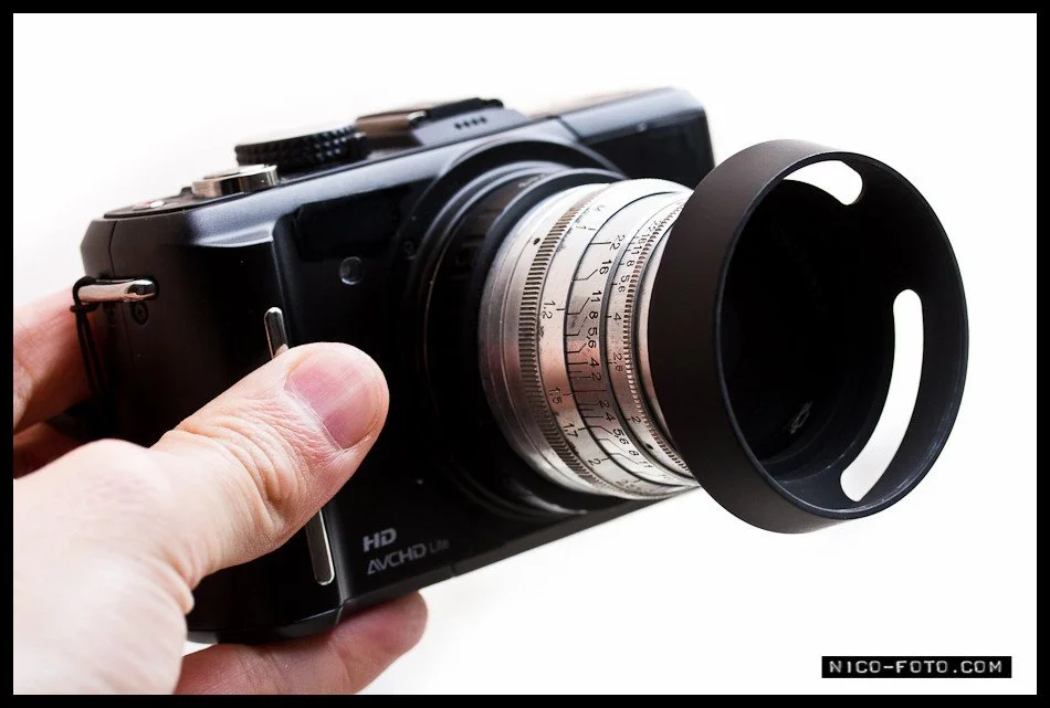 Like most rangefinder lenses it is quite compact, and matches Micro Four Thirds cameras nicely. The J-8 is known for being quite prone to flare, that makes the lens hood a must. Lens, L39 to m43 adapter and hood are around 8cm deep – not pancake sized but not that terrible either.